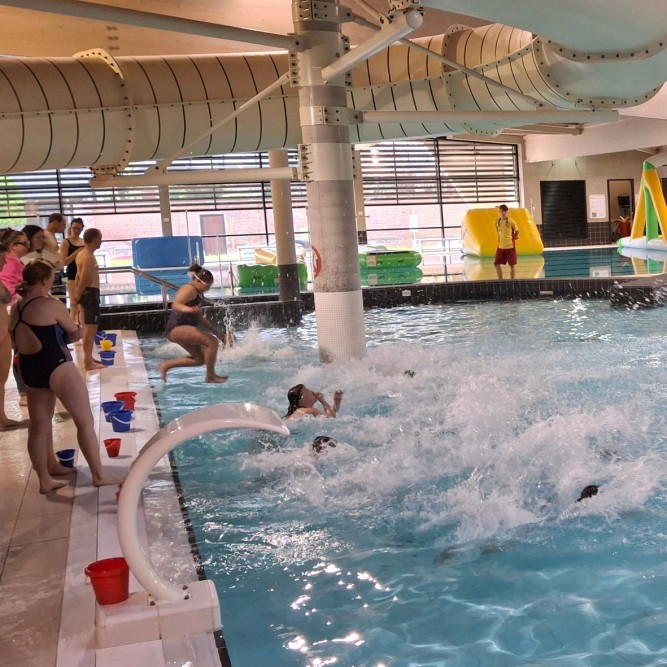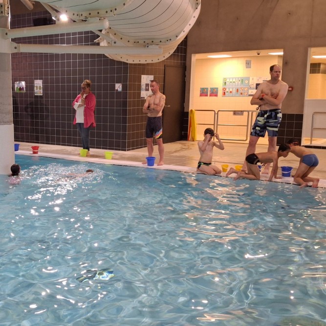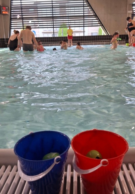 • les plus jeunes participants dans le bassin d'apprentissage (profondeur 70 cm) ; les enfants qui savent déjà nager dans le bassin de loisirs (profondeur 125 cm)